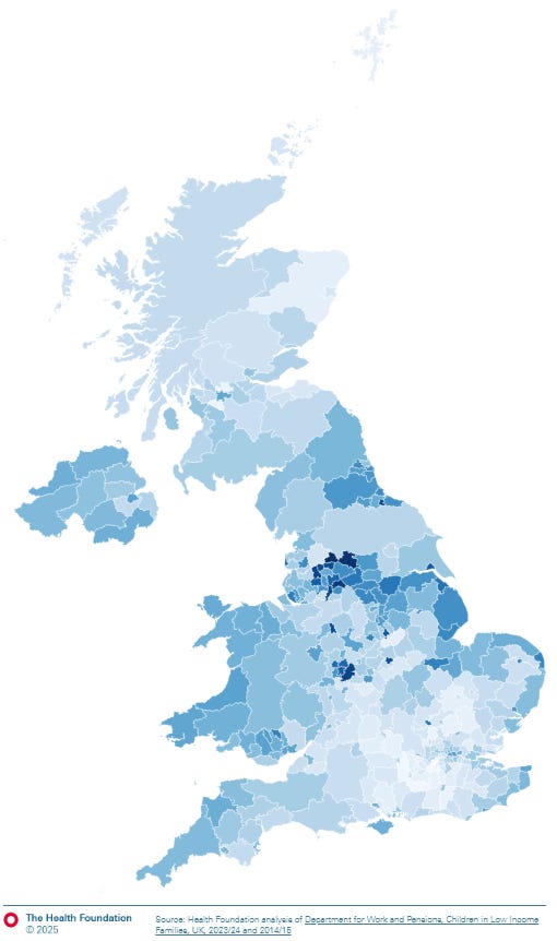Child poverty rates have also been stubbornly persistent. And it is highest in urban parts of the North (darker colours in map below). 2