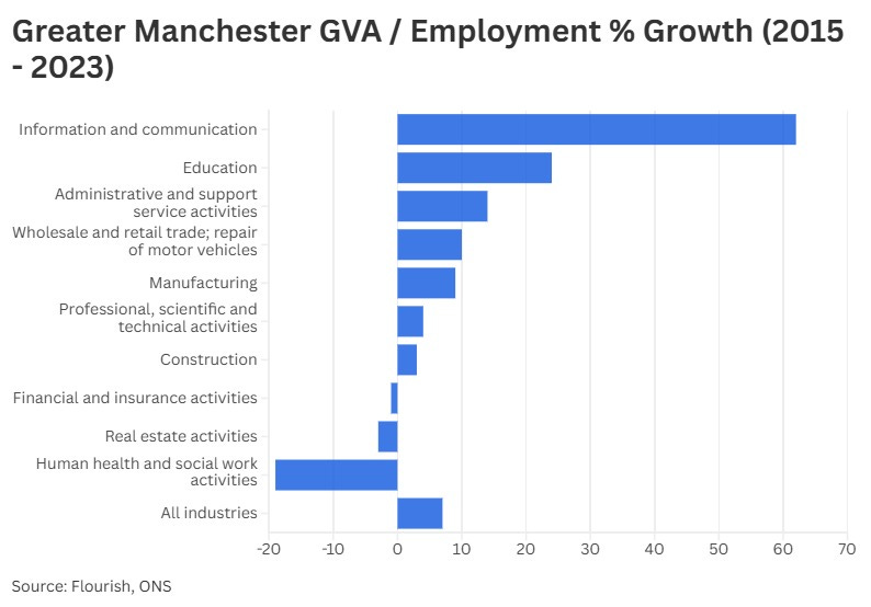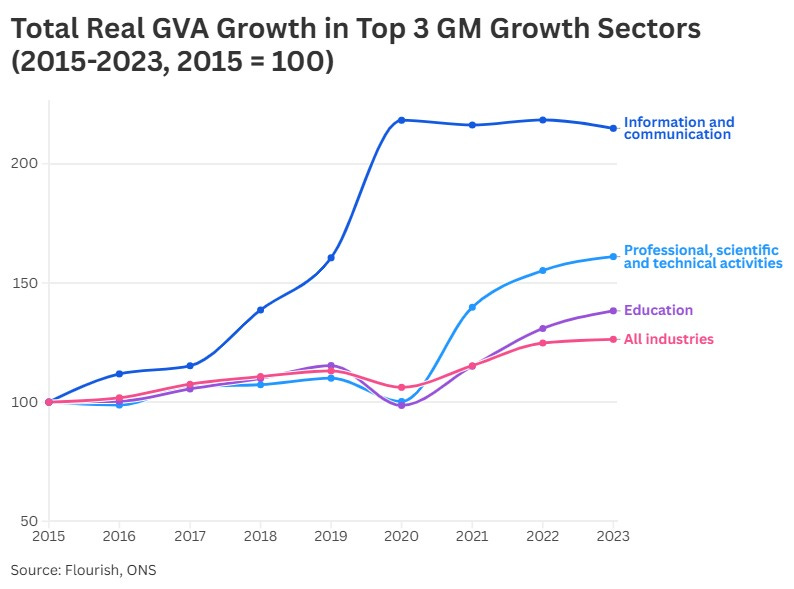 This is strong - but then I wondered how it compared to other places. Over the period 2015 to 2023 the highest GVA growth across the UK in these sectors has actually been in Cornwall and Isles of Scilly, South Yorkshire and Tees Valley. All of these areas saw GVA growth in information and communication above 150% compared to GM’s 115%.