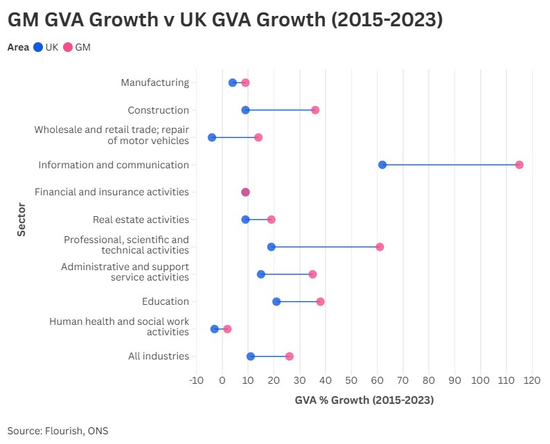 GM GVA growth has been above the average for UK GVA growth in almost every sector - often substantially. I took the 10 largest sectors in GM to show this trend in the chart below. These top 10 sectors are worth at least £4.5bn each to the GM economy. Every single one of them has had higher GVA growth than the national average.