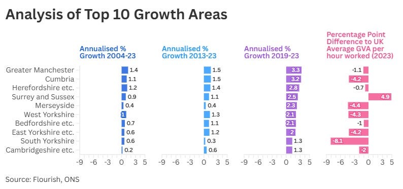 Listed below are these areas ranked in order of the growth from 2019 to 2023. I’ve also included the annualised productivity growth figures (GVA per hour worked - the ideal measure) since 2004 (the earliest the data goes) and since 2013 for interest (given that a decade is a rough good frame of reference). I’ve converted all the growth rates to annualised numbers to allow comparability across the time periods.