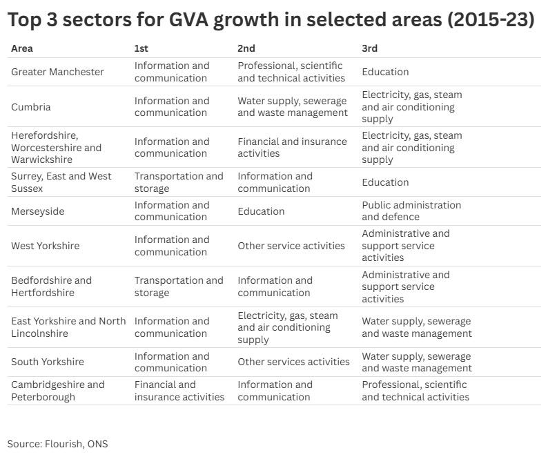 Information and communication is a key sector for growth in all ten of these areas. Three of the areas around London may have benefitted from the displacement of activity from the capital following the pandemic and as housing costs become a constraint there? Four of the areas with the deepest devolution might be starting to see the benefits of that devolution (and also happen to be next to each other in the North of England - some spillovers?). Two of the areas - Cumbria and the Humber area - have a big focus on clean energy which seems to be reflected in their growth sectors.